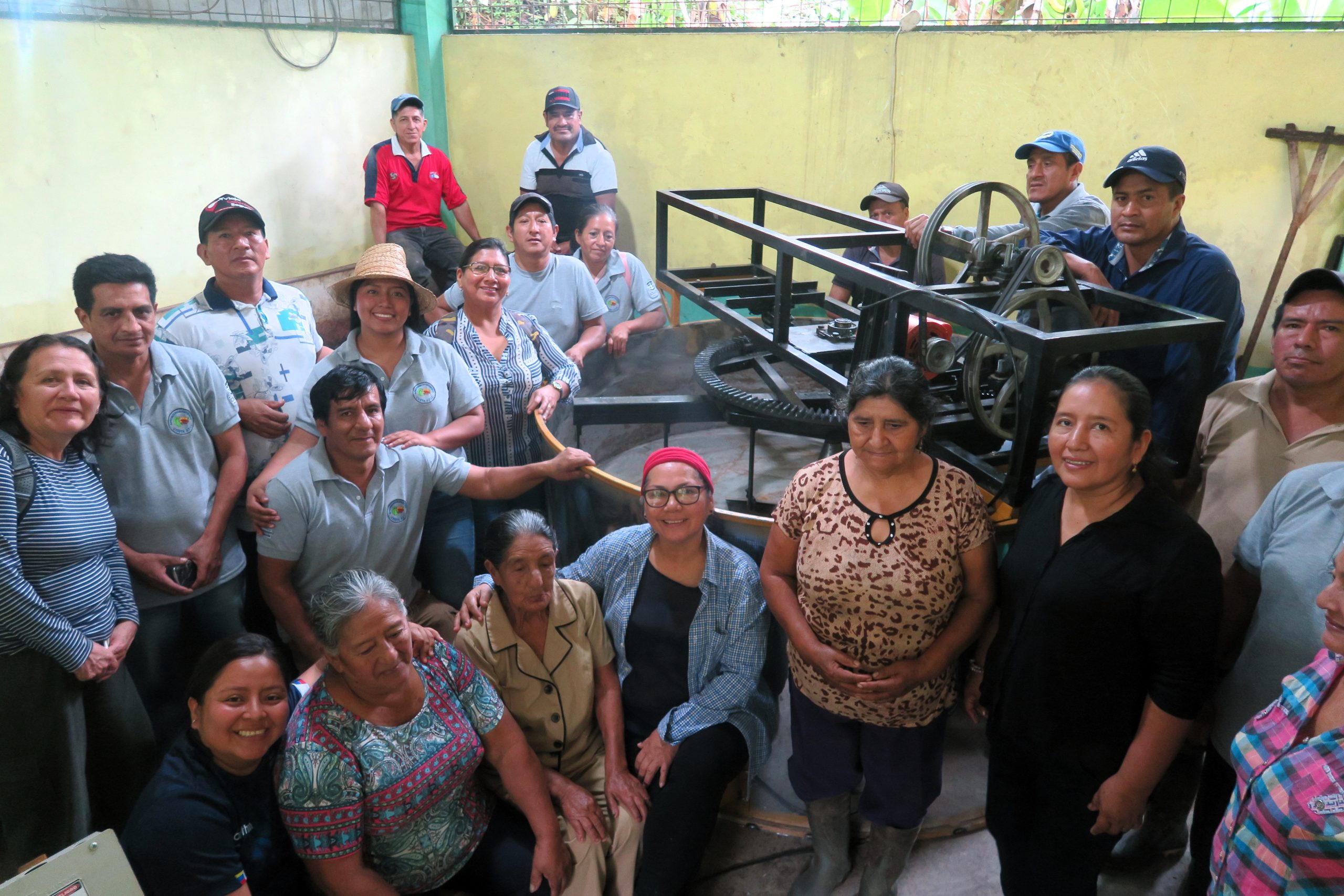 Miembros de la asociación de productores 10 de febrero posan junto a su nueva máquina secadora de cacao.