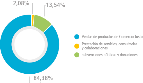 La fuente principal de estos ingresos proviene de la venta de productos de Comercio Justo, Economía Solidaria y Agricultura Ecológica. La segunda fuente ingresos, por orden de importancia, es la que proviene de las subvenciones públicas. Por último, gracias a la capacidad de adaptación y de crecernos ante las adversidades, nuestra tercera fuente de ingresos, la que proviene de la prestación de servicios de investigación, consultorÌa, formación, licitaciones públicas y privadas, y otras colaboraciones diversas, creció notablemente.
