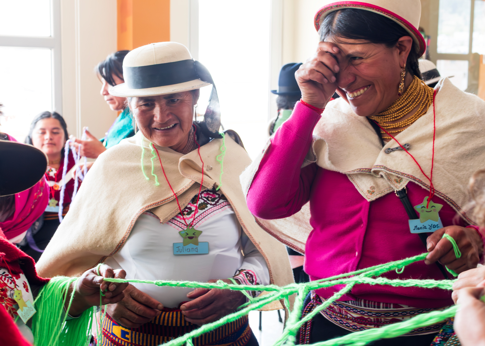 Juliana Galarza, de la Comunidad Mercedes Cadena, y Presentación Yasaca, de la parroquia Palmira, sonríen en un encuentro de «Mujeres como la luz«, la red de apoyo mutuo creada con el respaldo de la solidaridad andaluza, que busca promover la participación de las mujeres en las políticas locales por la igualdad y contra la violencia de género en su territorio. Esta red propicia espacios de sororidad seguros, donde las mujeres de la región pueden establecer vínculos, compartir sus retos y experiencias de vida en ocasiones difíciles, debido a la violencia y la discriminación. El trabajo de la red contribuye a fortalecer la identidad y la autoestima de las mujeres y capacitarse para ejercer liderazgo en sus comunidades. |