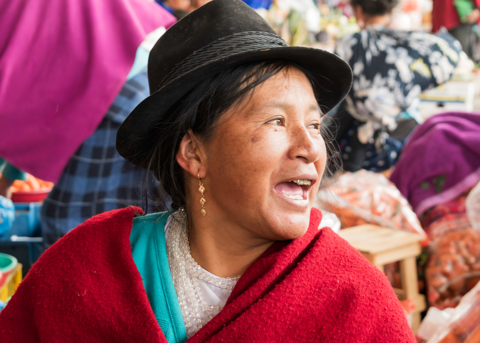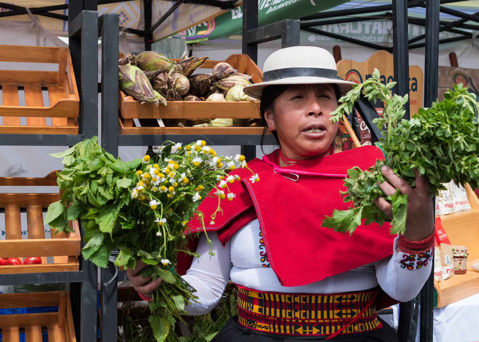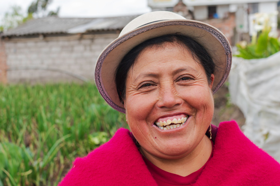 Leonor Guamán, productora ecológica y vendedora en el mercado de verduras de Guamote. Las mujeres productoras habitualmente cumplen con una triple responsabilidad ya que se encargan, no solo de cultivar, sino también de vender lo que producen y de realizar los cuidados del hogar. Participando en «Mujeres como la Luz», las mujeres productoras tratan de superar juntas sus retos diarios a través del apoyo mutuo. También se capacitan en como gestionar sus negocios y cooperan para vender sus productos en el mercado. |