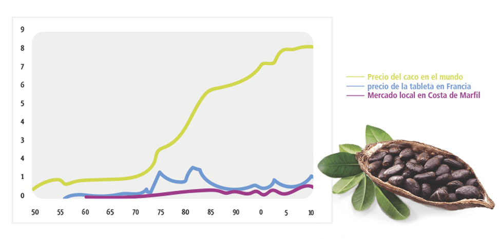 Ejemplo correlación del precio de la tableta en Francia, el mercado mundial cacao y mercado local en Costa de Marfil
