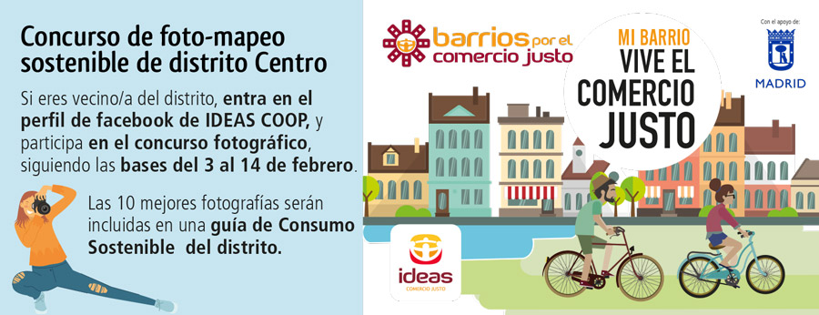 En IDEAS a través del proyecto Barrios por el Comercio Justo, hemos organizado un original y solidario concurso de fotografía. El objetivo es dar a conocer iniciativas de Consumo sostenible y convivencia ciudadana en esta zona de la ciudad de Madrid. Para ellos os proponemos “mapear” los barrios de Embajadores, Lavapies y La Latina haciendo fotografías a lugares, no a personas, de consumo sostenible y convivencia vecinal. Basta con salir a la calle a la calle con tu móvil o cámara y compartir en Facebook tu fotografía, acompañada de una pequeña explicación sobre la imagen que identifique el lugar concreto donde fue realizada y por qué la has elegido. El concurso estará activo del 3 al 14 de febrero y toda la información y bases está en el perfil de Facebook de IDEAS. https://www.facebook.com/ideas.comerciojusto/